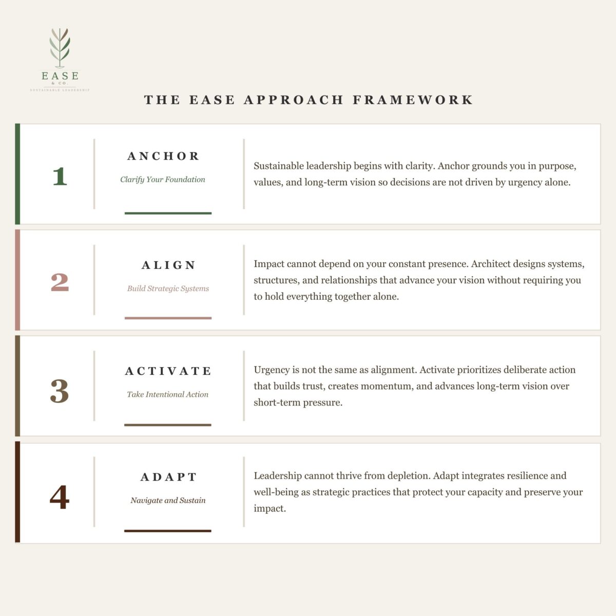 The ease approach Leading with clarity.Building with intention.Sustaining with purpose. Leadership that delivers results without demanding your depletion. Get Started The EASE Approach is a proprietary four-pillar framework that provides leaders with a strategic map for building leadership that endures. Ready to move from urgency to clarity? This is where we begin.